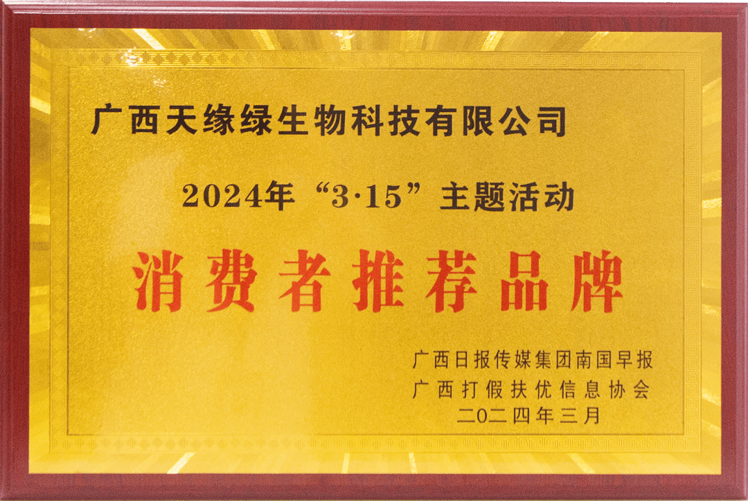 廣西天緣綠科技集團(tuán)母公司——廣西天緣綠生物科技有限公司,在2024年“3·15”主題活動(dòng)中脫穎而出,獲授消費(fèi)者推薦品牌。這一榮譽(yù)的獲得,并非偶然,而是源自于無數(shù)消費(fèi)者對天緣綠集團(tuán)深厚的信賴與堅(jiān)定的支持。